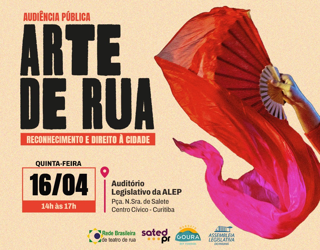 Nesta quinta-feira (16) a Arte de Rua entra em pauta na Assembleia Legislativa do Paraná (Alep). O deputado estadual Goura (PDT), em parceria com o Sindicato dos Artistas e Técnicos das Artes Cênicas e Audiovisual do Paraná (SATED/PR) e a Rede Brasileira de Teatro de Rua, realizam audiência pública para discutir as demandas das e dos artistas que se apresentam e espaços públicos.