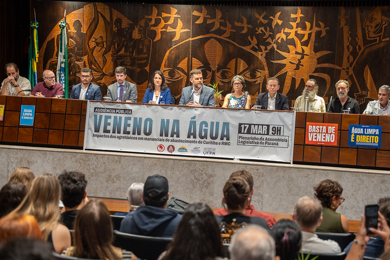 A Assembleia Legislativa promoveu, na manhã desta terça-feira (17), a audiência pública “Veneno na Água: Impacto dos Agrotóxicos em Mananciais de Abastecimento de Curitiba e da RMC”, que debateu o uso de agrotóxicos e seus impactos na saúde pública, no meio ambiente e na produção agrícola. Promovido pelo deputado Goura (PDT), o encontro reuniu especialistas e estudiosos de diversas áreas, que demonstraram os riscos do uso indiscriminado desses produtos à população. Estudos recentes comprovam que o Brasil é o líder mundial no uso de agrotóxicos.