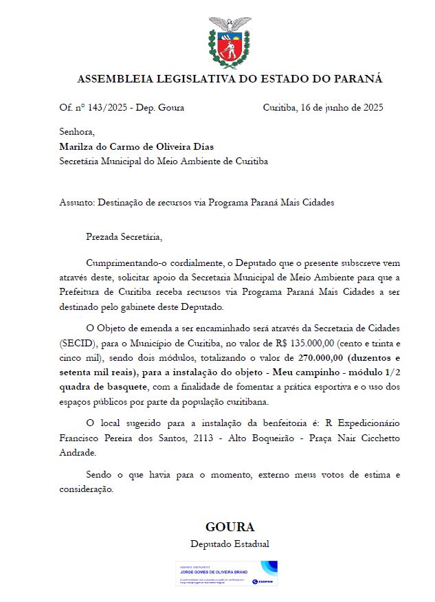 Goura pediu ao secretário o encaminhamento das verbas das emendas do programa “Paraná Mais Cidades 2025” feitas por ele no valor de R$ 270 mil, com indicação para instalação de dois módulos do projeto Meu Campinho, com meia quadra de basquete cada, na Praça Nair Cicchetto Andrade, na Rua Expedicionário Francisco Pereira dos Santos.