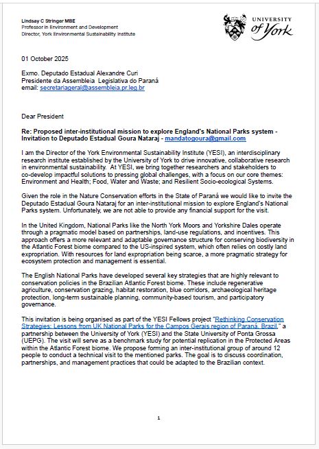A viagem acontece a convite da Universidade Estadual de Ponta Grossa (UEPG) e da Universidade de York, dentro do projeto “Repensando Estratégias de Conservação: Lições dos Parques Nacionais do Reino Unido para os Campos Gerais do Paraná”, coordenado pelo professor Carlos Hugo Rocha (UEPG) e pela professora Lindsay C. Stringer, diretora do Instituto de Sustentabilidade Ambiental de York (YESI).